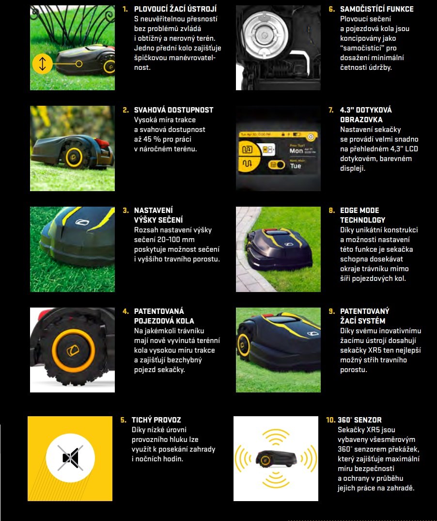 Model XR5 byl navržen tak, aby sekal s maximální možnou přesností, na rovném i svažitém terénu, v ideálních i obtížnějších podmínkách, za každého počasí, ve dne i v noci, tiše a bez emisí výfukových plynů. Byl navržen tak, aby udržoval váš trávník nejenom svůdný na pohled, ale aby byl trávník i zdravý a silný. A vy se mezi tím můžete věnovat všem aktivitám, které máte na zahradě rádi