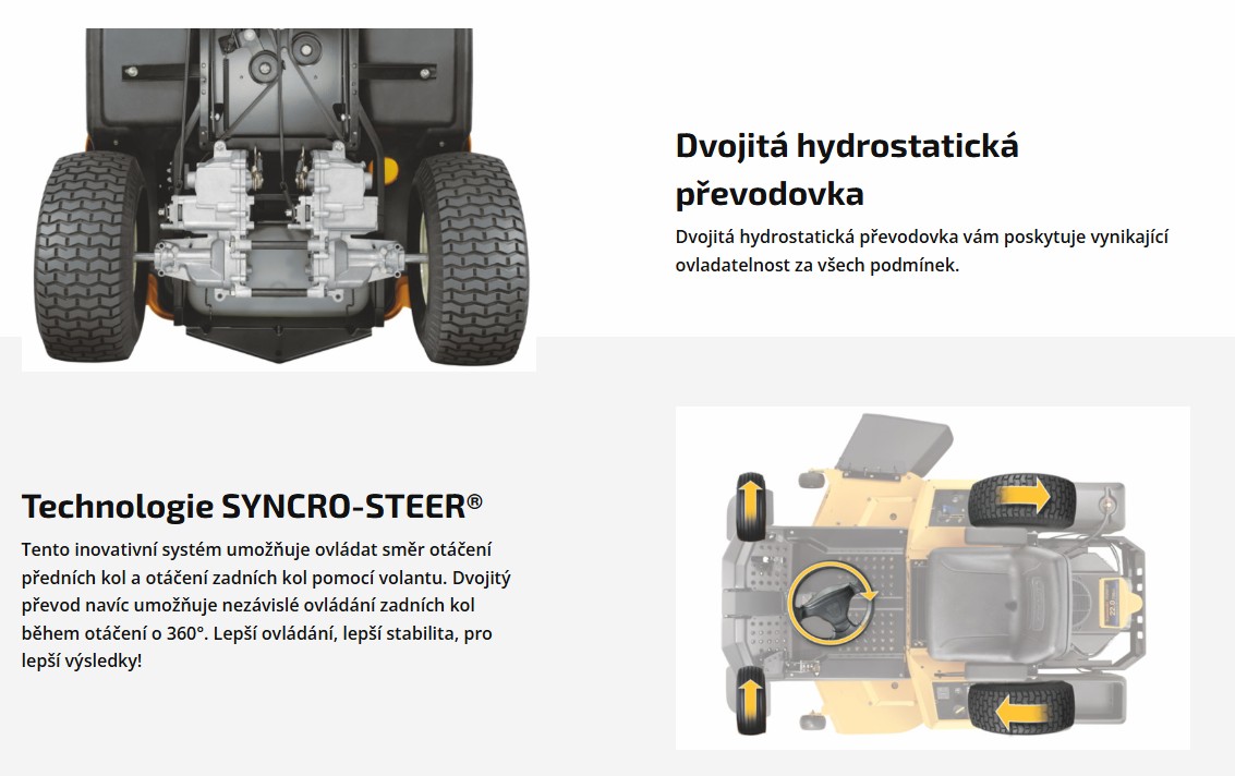 V traktoru se spojil výkon a výkonnost. Celosvětově první technologie Zero-Turn s řízením volantem a zatáčením všech kol pro nedostižný výkon a stabilitu. S účinností a dlouhou životností výkonného motoru se z každého sečení stane dobrodružství.